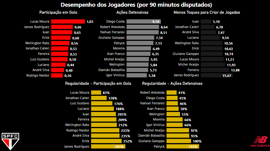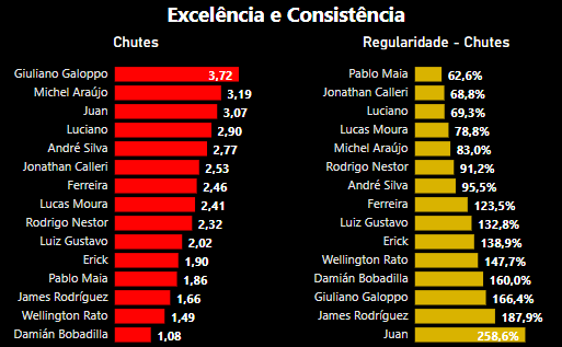 No entanto, em contrapartida, temos três jogadores que se destacam em manter um bom nível de regularidade nos chutes. Pablo Maia, Calleri e Luciano são os melhores, respectivamente. Com um certo destaque maior para o Luciano, que tem em média aproximadamente 0,4 chutes a mais por jogo que o Calleri, sendo o quarto jogador que mais chuta na equipe, mantendo um nível bem próximo da regularidade do argentino.
