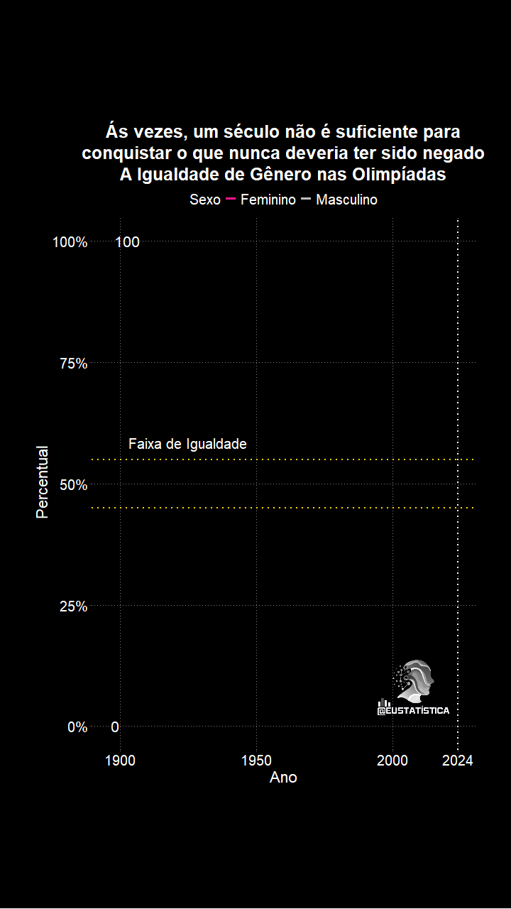 Representatividade essa que alcançou o marco histórico de 50% de mulheres nos jogos olímpicos de 2024. Conforme podemos ver no visual temporal abaixo.