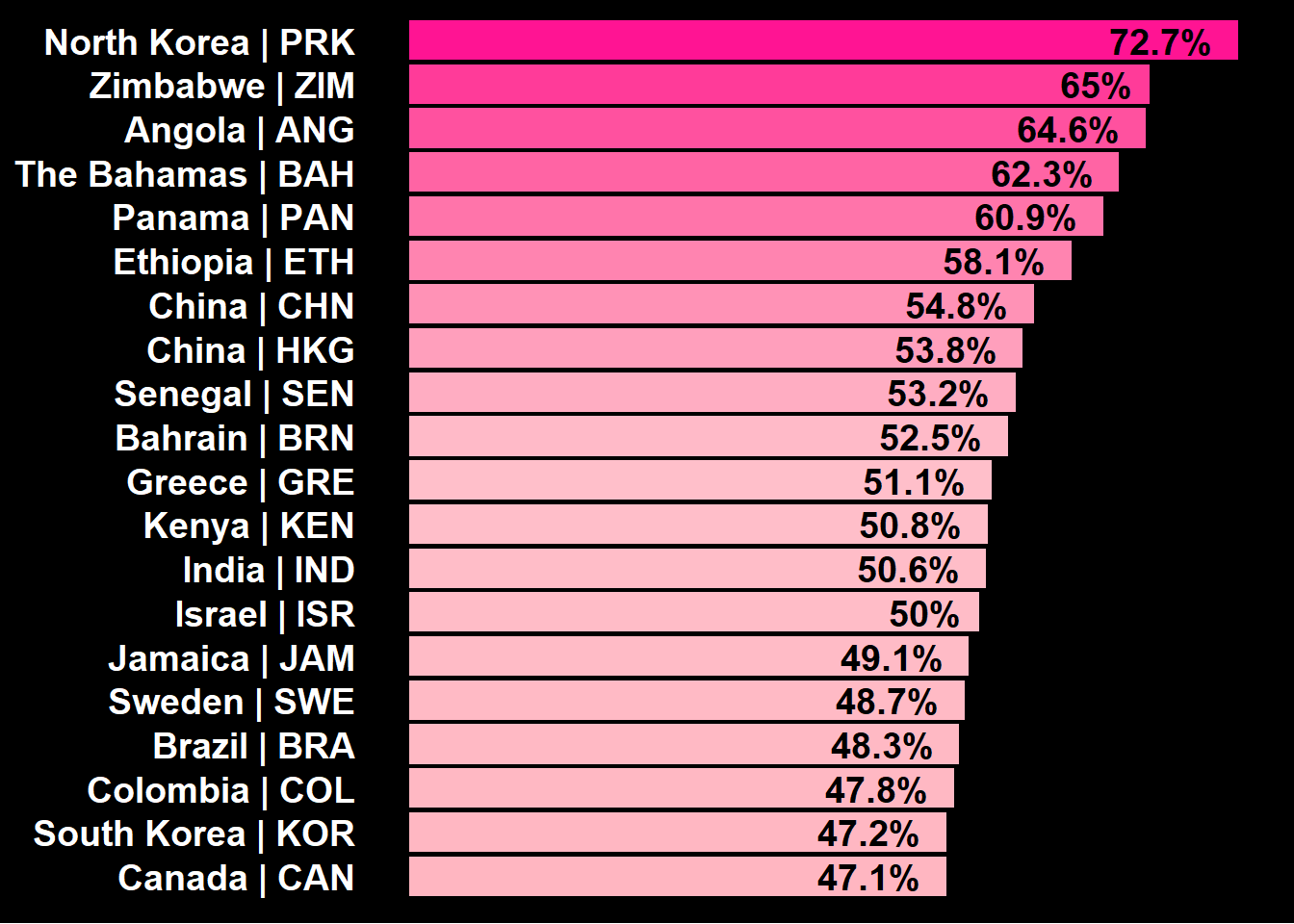Porém, ali perto, de forma mais discreta, temos um destaque ainda maior: a Coreia do Norte, com cerca de 72% de representatividade feminina. De maneira geral, os países asiáticos próximos a essa região permanecem dentro da faixa de igualdade que estabeleci.