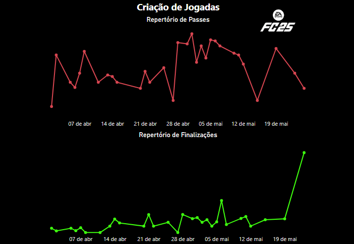Quando comecei a jogar EAFC no fim do ano passado, senti muita necessidade de aumentar minha diversidade de jogadas e, assim, comecei a coletar e analisar meus próprios dados e a desenvolver métricas que me ajudaram a evoluir. Veja uma imagem da minha evolução no repertório de finalizações e passes ao longo do tempo.